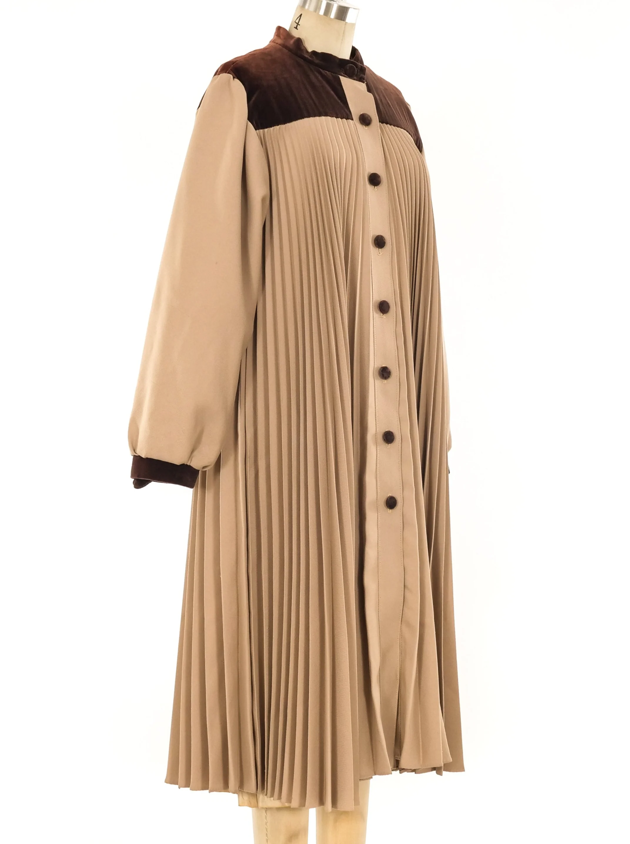 - Khaki accordion pleated swing coat with chocolate velvet yoke and trim