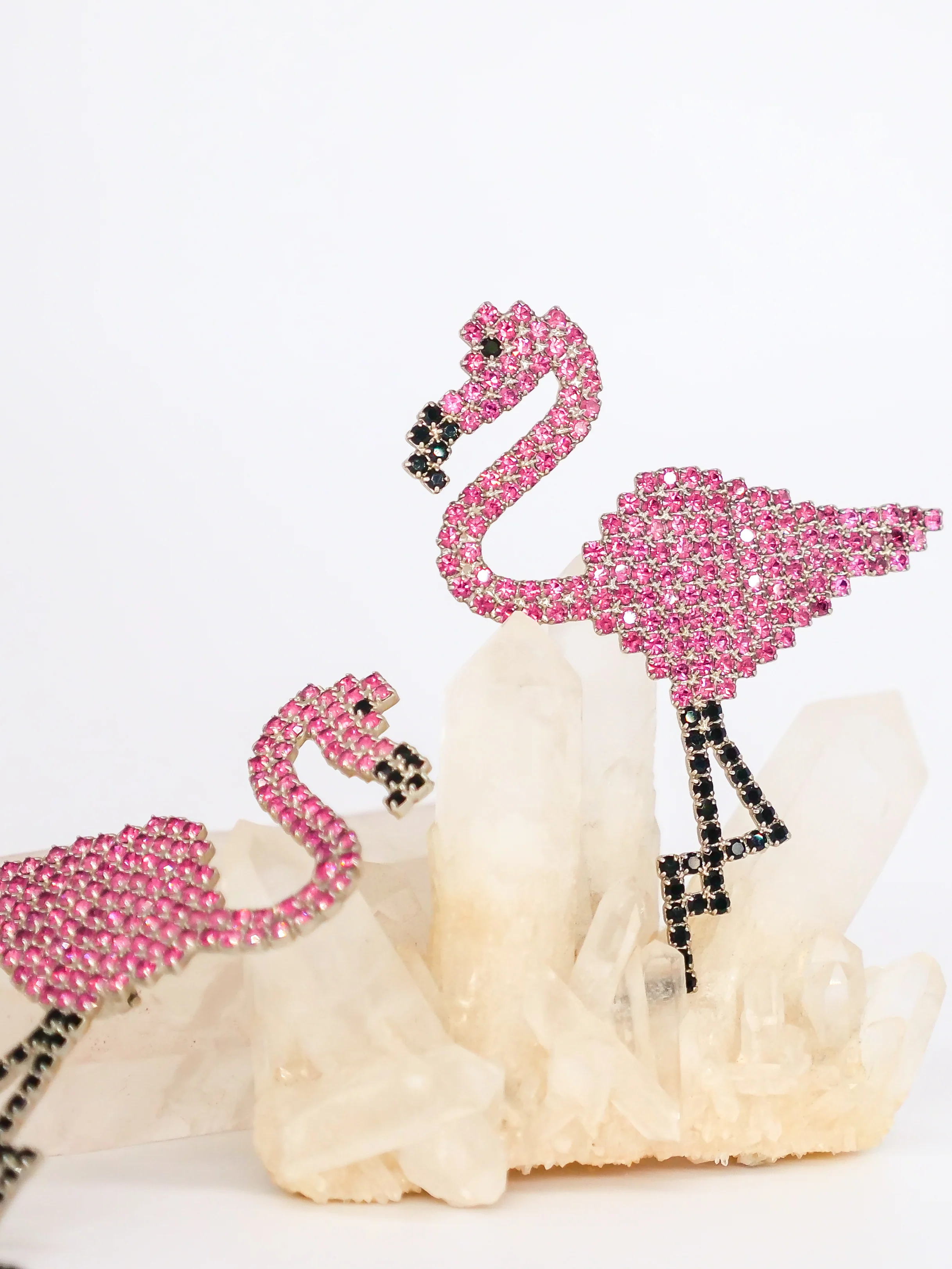 - Bauer rhinestone earrings in the shape of flamingos