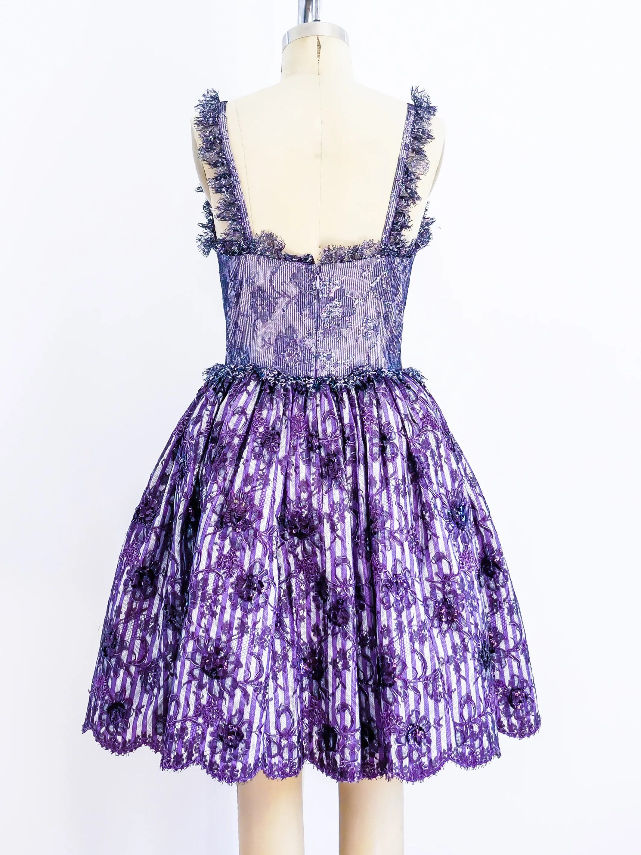 - Purple lace embellished with embroidery and sequins overlaid on purple striped cotton shirting