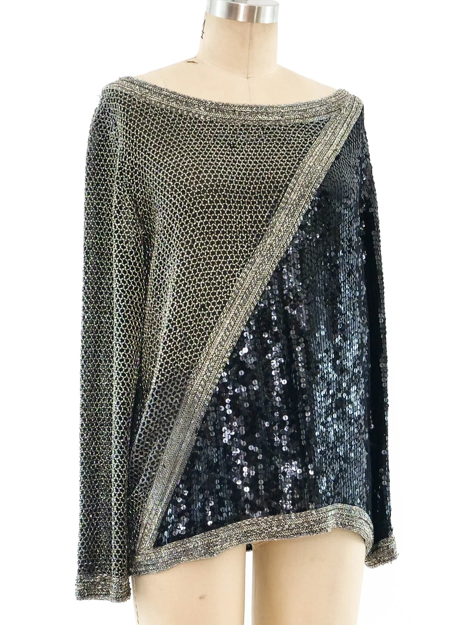 - Two tone split metallic silver bead and iridescent black sequin embellished silk