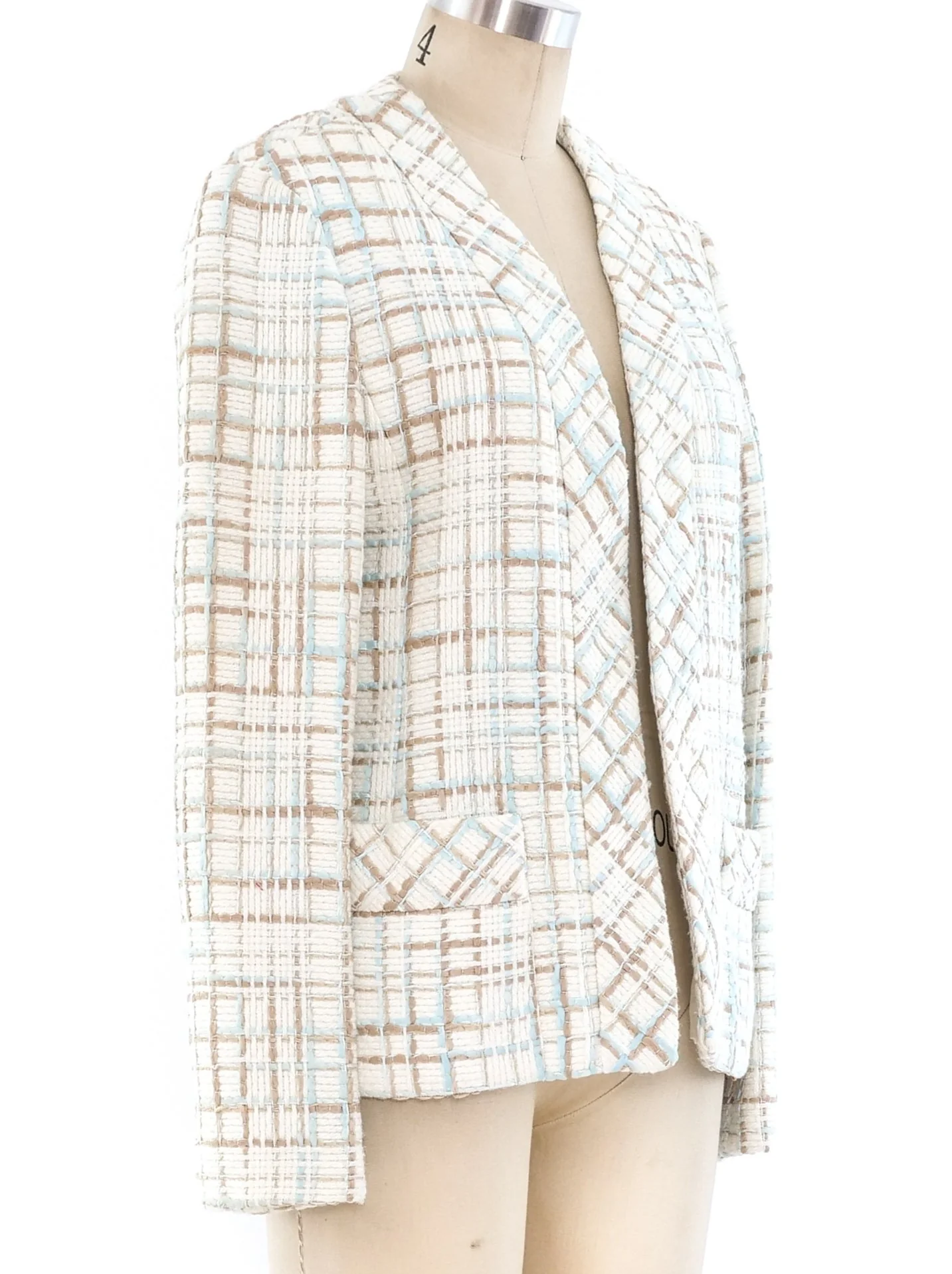- Cream tweed jacket with pastel blue and tan weave detail