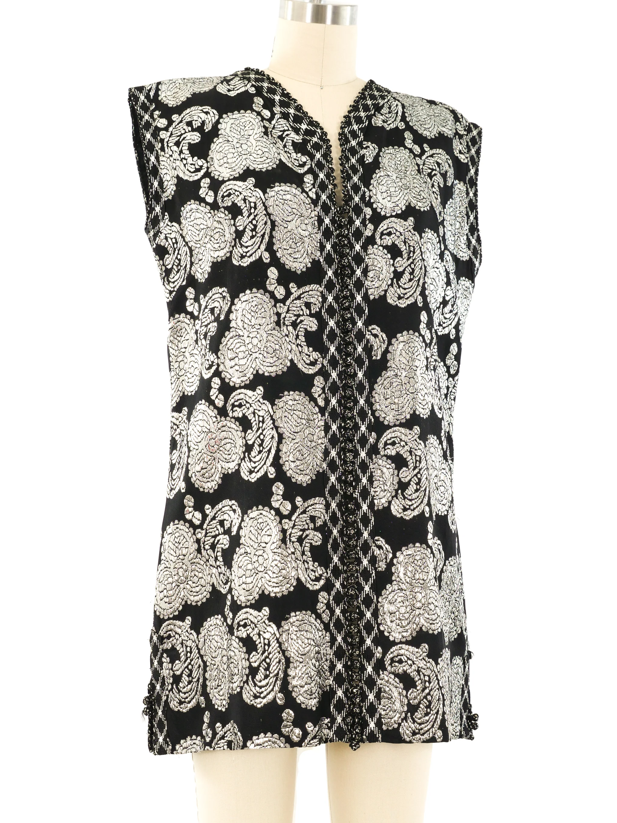 - Metallic silver paisley brocade vest with tonal ribbon trim