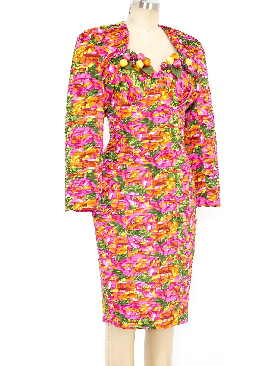 - Floral printed satin bustier dress and bolero jacket ensemble with faux fruit embellished trim