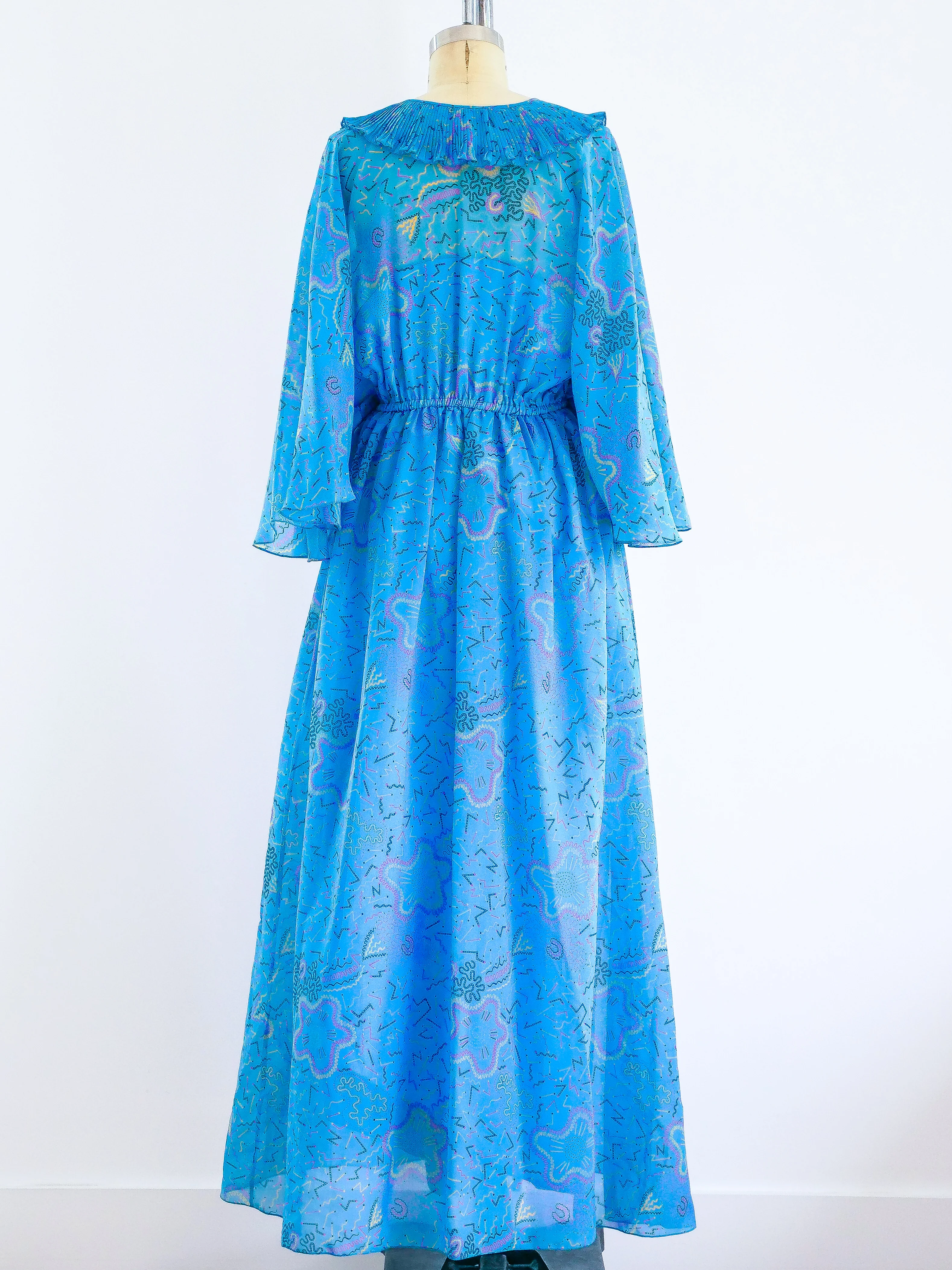 Zandra Rhodes sky blue printed caftan with pleated ruffle trim